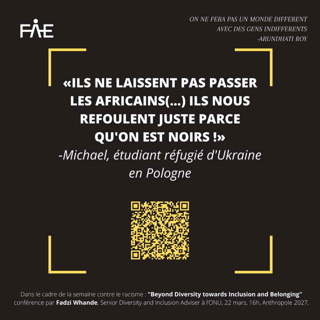- « Ils ne laissent pas passer les africains (…) Ils nous refoulent juste parce qu’on est noirs ! » Témoignage de Michael, étudiant réfugié d’Ukraine en Pologne https://fr.euronews.com/2022/03/01/guerre-en-ukraine-des-refugies-africains-bloques-aux-frontieres-se-disent-etre-victimes-de