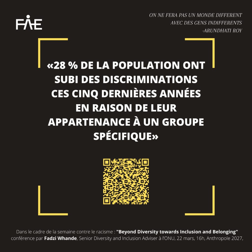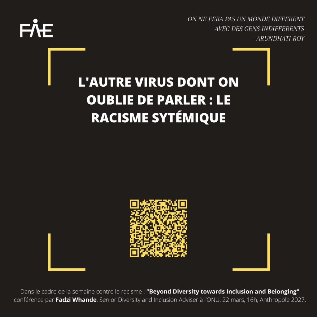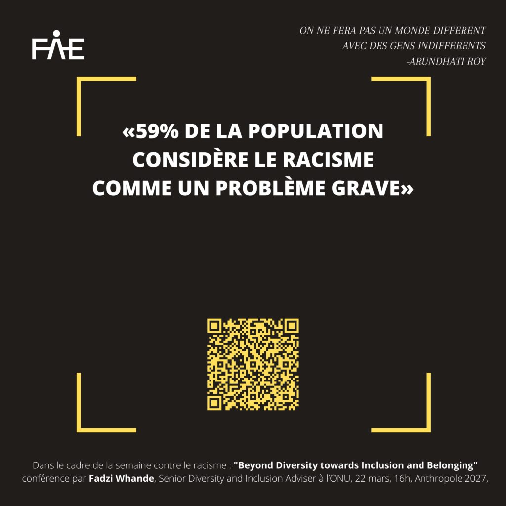 La discrimination raciale fait encore partie du quotidien. Depuis le scandale de la mort de George Floyd et la création du mouvement #Blacklivesmatter ces questions sont à nouveau sur le devant de la scène. Lors de la semaine du 21 mars – Journée internationale pour l’élimination de la discrimination raciale commémorant le massacre à caractère racial des manifestant·e·x·s contre le régime d’apartheid en Afrique du Sud – nous tenions à informer et à prendre conscience ensemble de l’actualité de cette injustice. Puisque, comme l’écrit Arundhati Roy l’écrivaine militante indienne « On ne fera pas un monde différent avec des gens indifférents », informe-toi et ne reste pas indifférent·e·x afin de soutenir les victimes de ces attaques et d’agir chacun·e·x à notre échelle pour lutter contre les discriminations raciales. Des stickers aux différentes conférences, dont celle proposée par la FAE le 22 mars, en passant par ce site servant à te rediriger vers d’autres sources, éveillons-nous.
