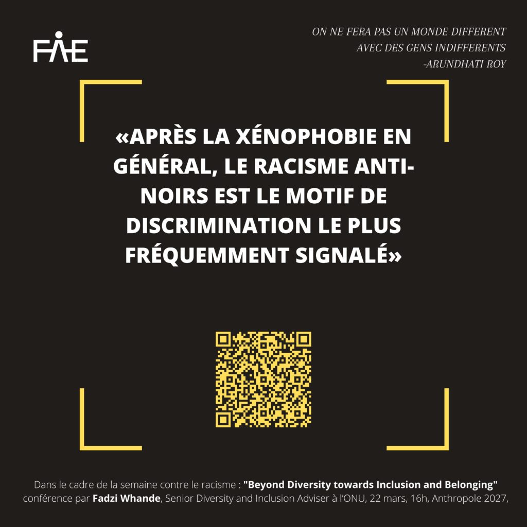 - Après la xénophobie en général, le racisme anti-Noirs est le motif de discrimination le plus fréquemment signalé. Rapport 2018 sur les incidents racistes recensés par les centres de conseil. https://network-racism.ch/cms/upload/pdf/Rassismusbericht_18_F.pdf