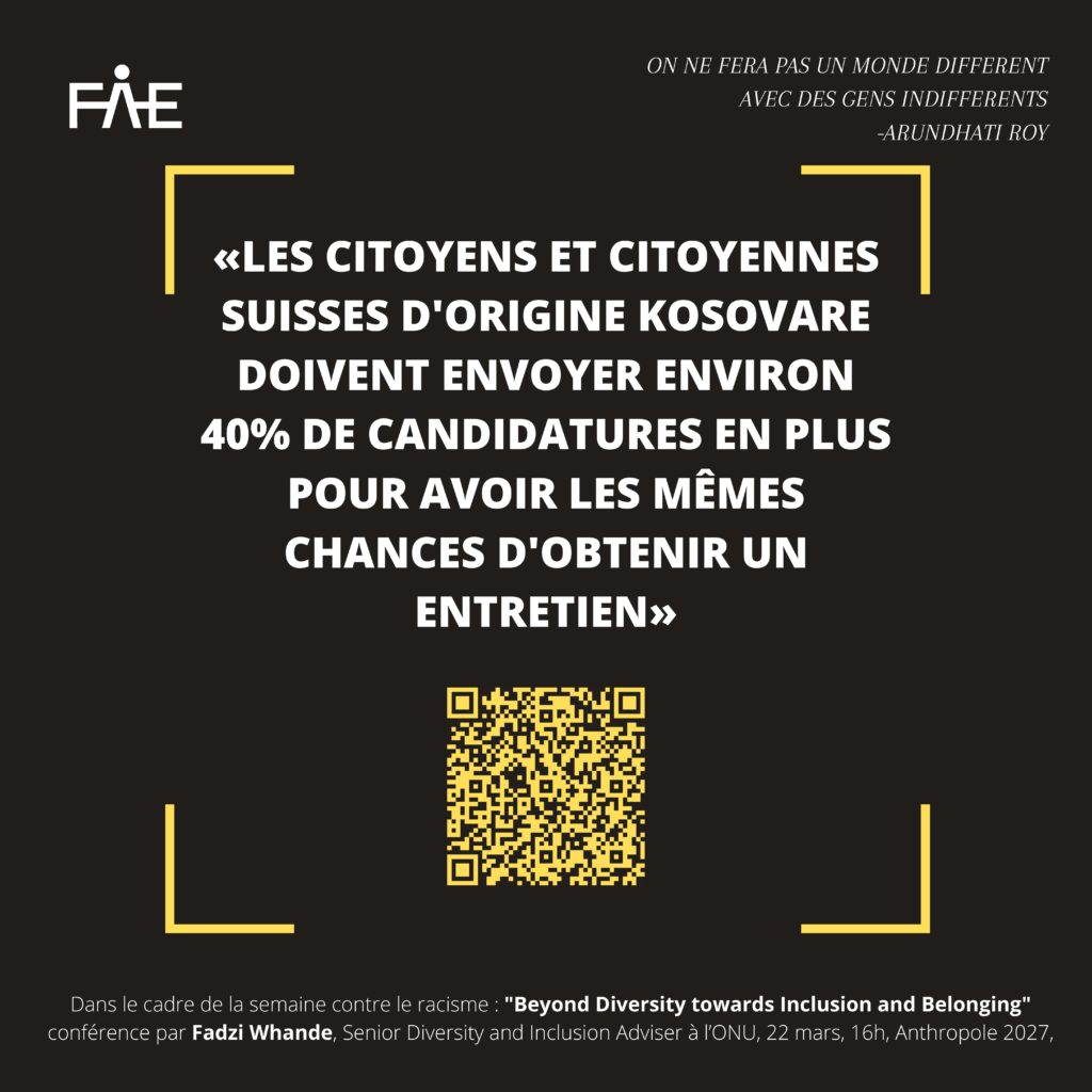- « Les citoyens et citoyennes suisses d’origine kosovare doivent envoyer environ 40% de candidatures en plus pour avoir les mêmes chances d’obtenir un entretien. » Forum suisse pour l’étude des migrations et de la population à l’Université de Neuchâtel https://www.unine.ch/sfm/sfm