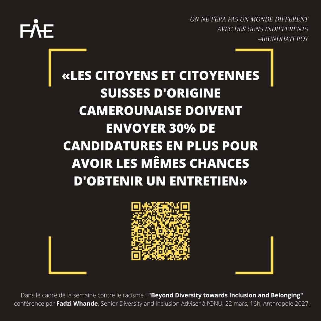 - « Les citoyens et citoyennes suisses d’origine camerounaise doivent envoyer environ 30% de candidatures en plus pour avoir les mêmes chances d’obtenir un entretien”. Forum suisse pour l’étude des migrations et de la population à l’Université de Neuchâtel https://www.unine.ch/sfm/sfm